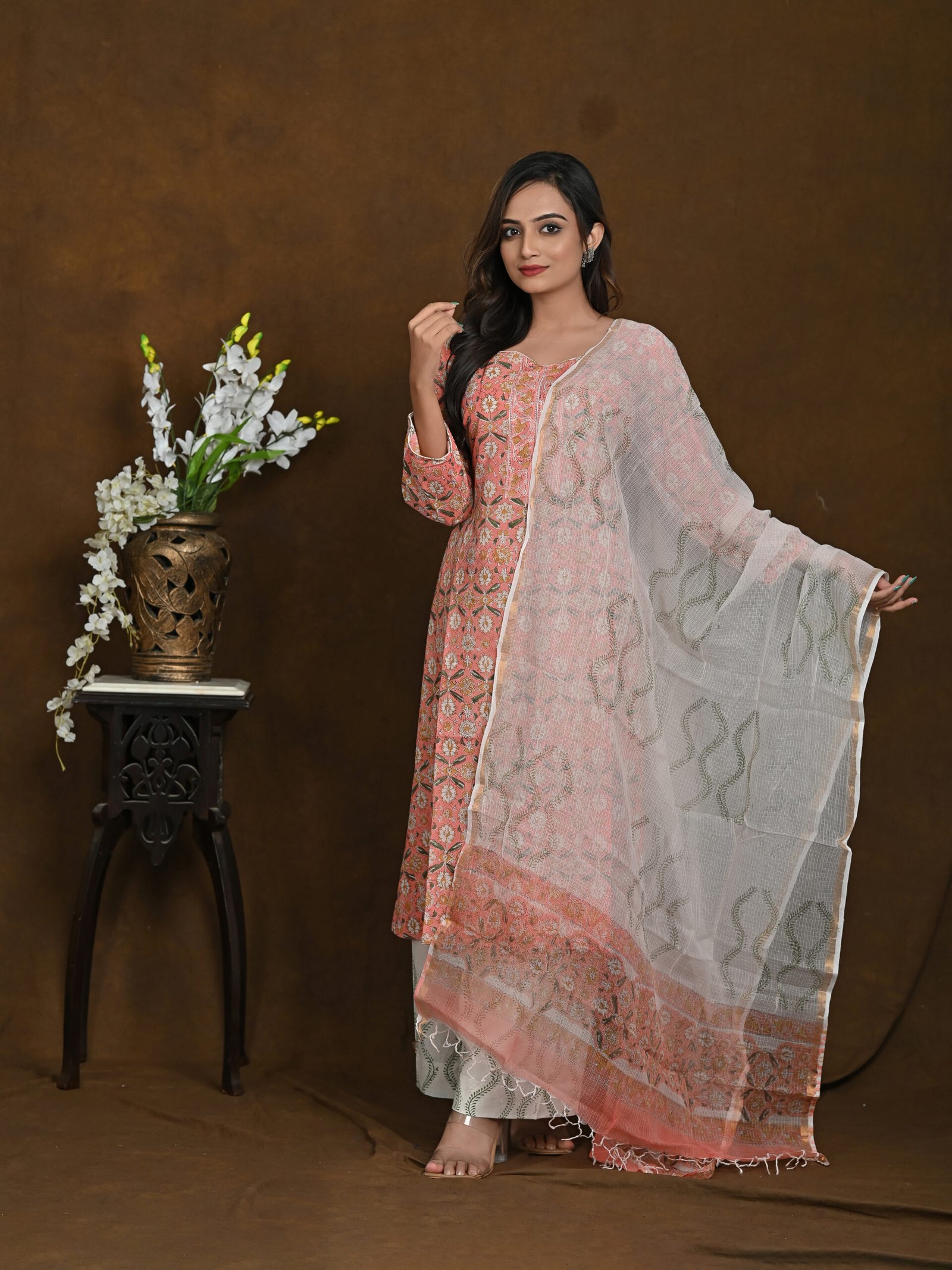 Adrika’s Pale Orange Pure Hand Block Cotton 3 Pc Kurti Set