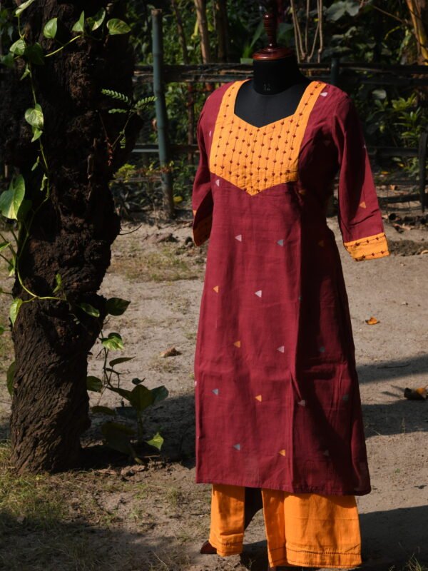Adrika’s Maroon Handloom Cotton Jamdani Hand Embroidered Kurti Set