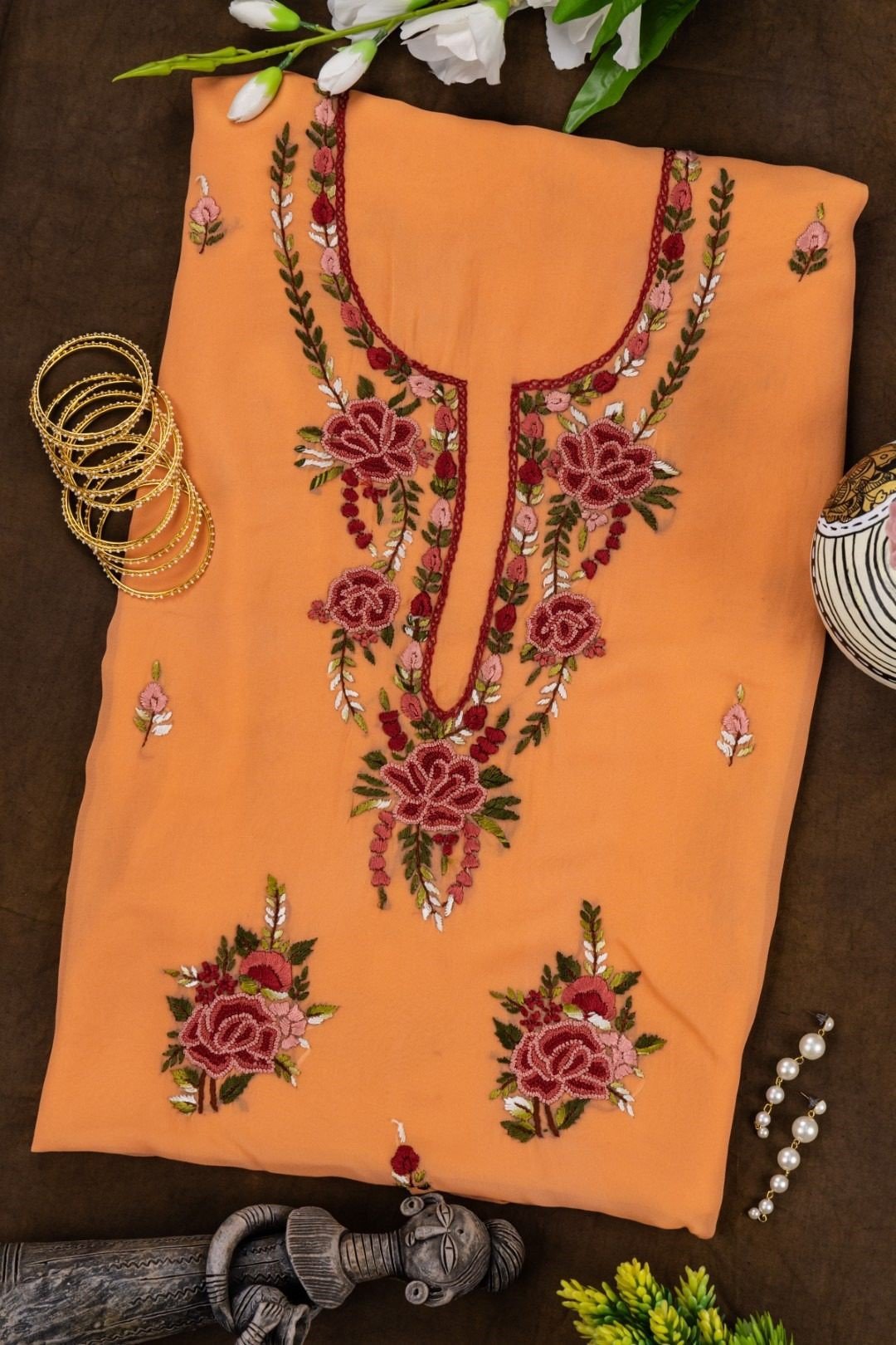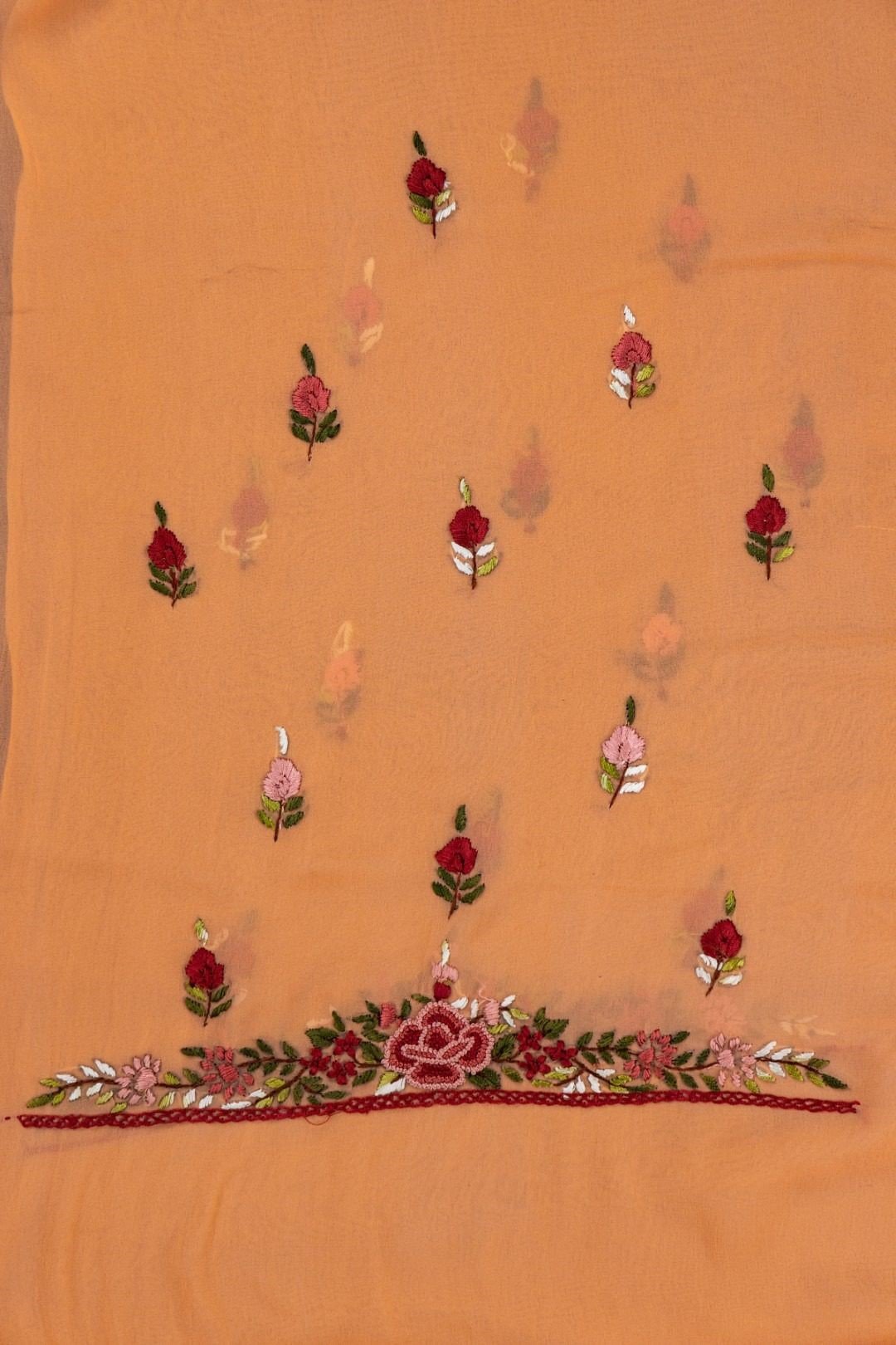 This apricot orange georgette hand embroidered unstitched kurta offers a comfortable & relaxed silhouette to the wearer, the fabric & embroidery is skin friendly.