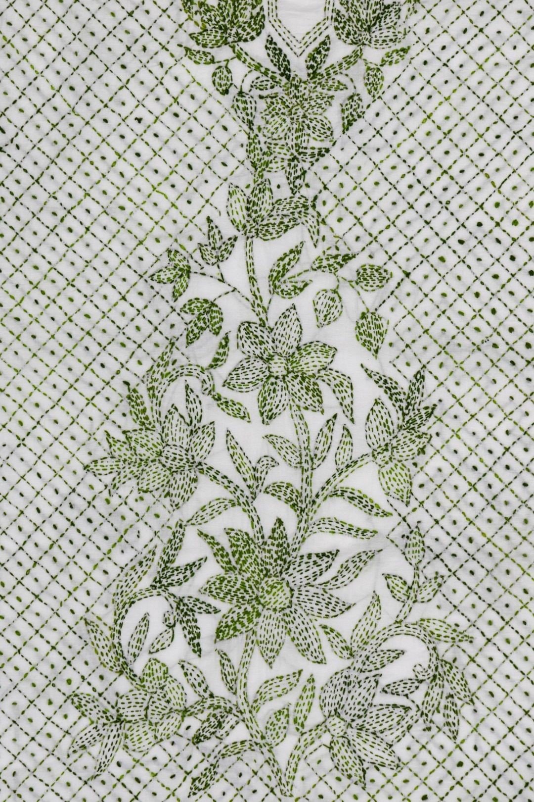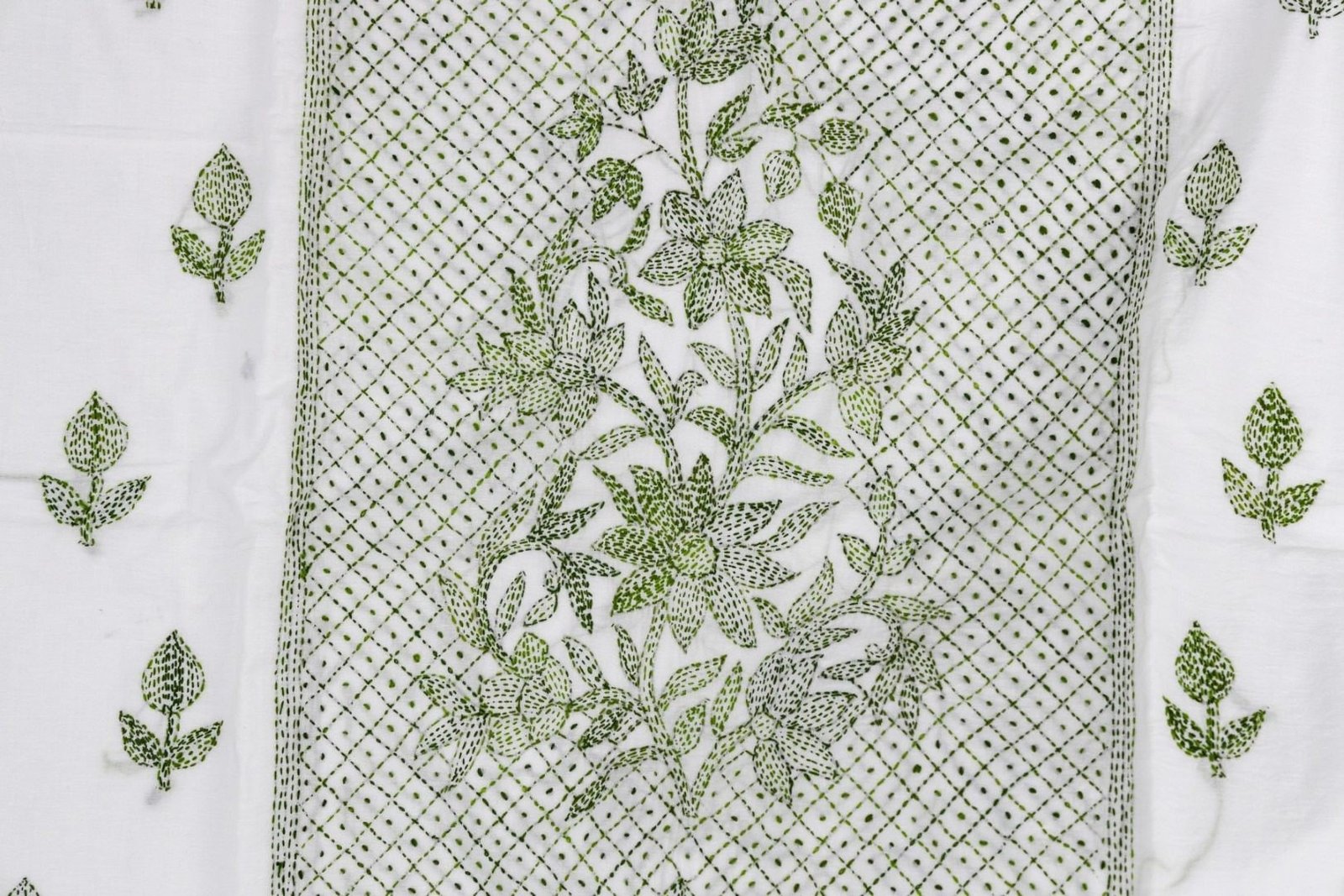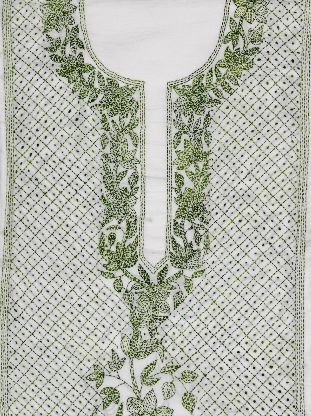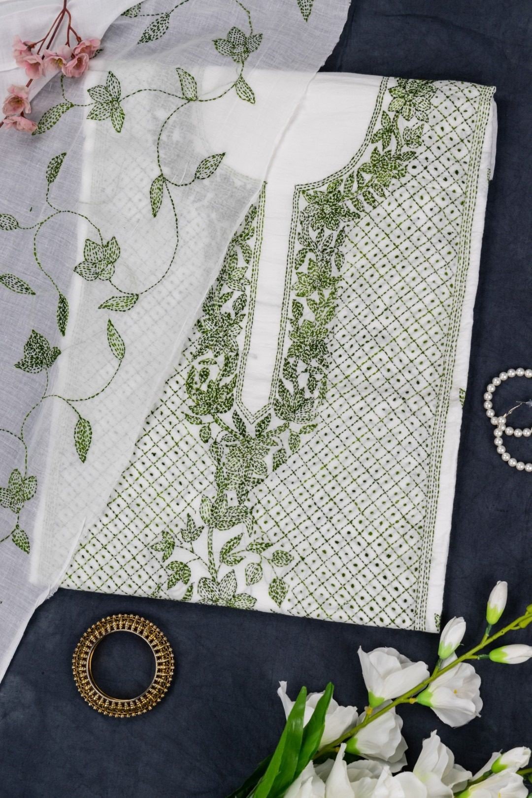 This white cotton hand embroidered unstitched 3 pc kurta set offers a comfortable & relaxed silhouette to the wearer,the fabric & embroidery is skin friendly.