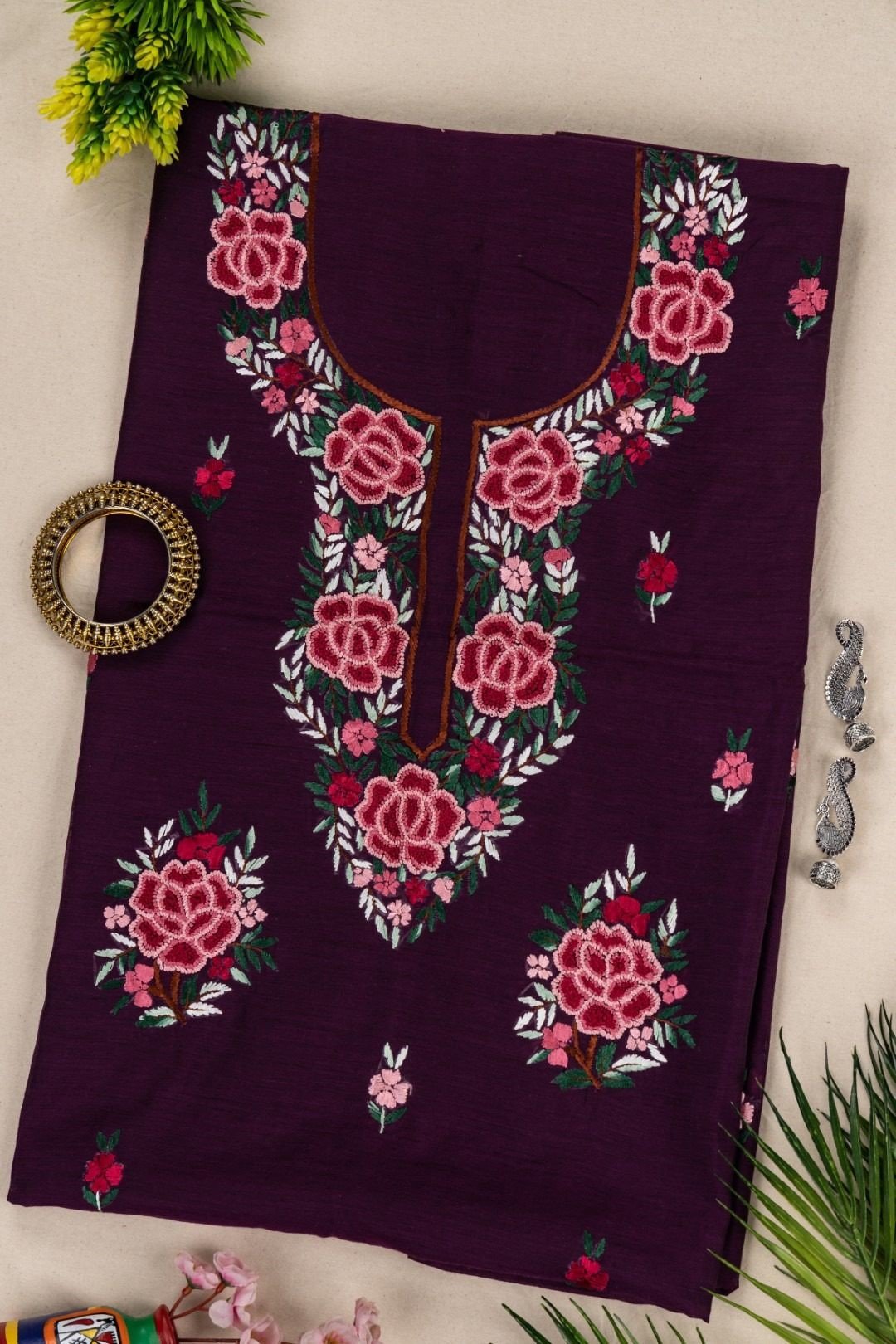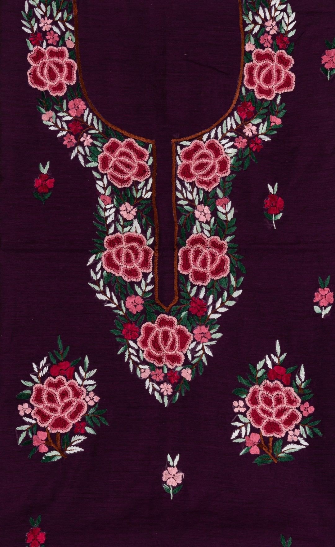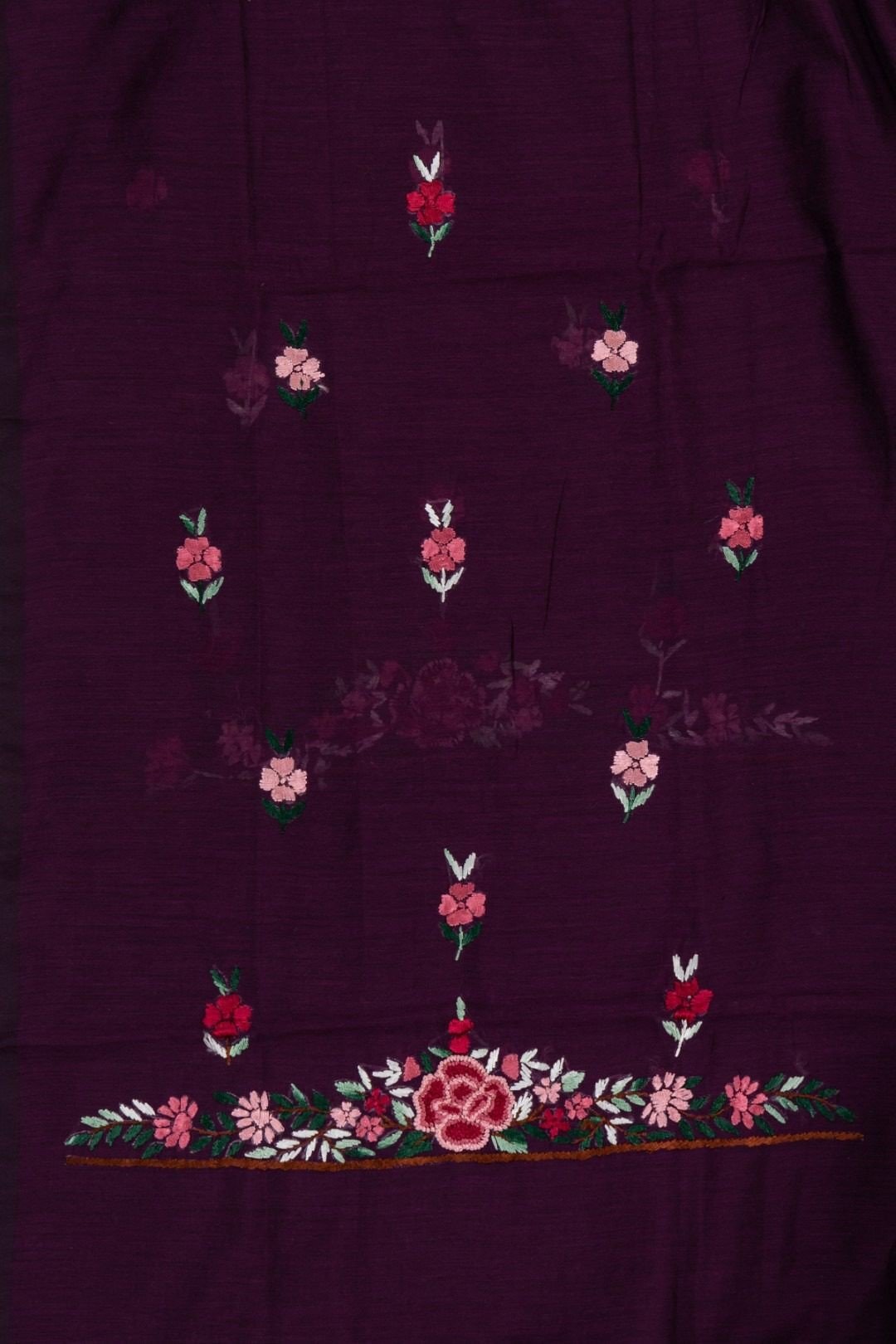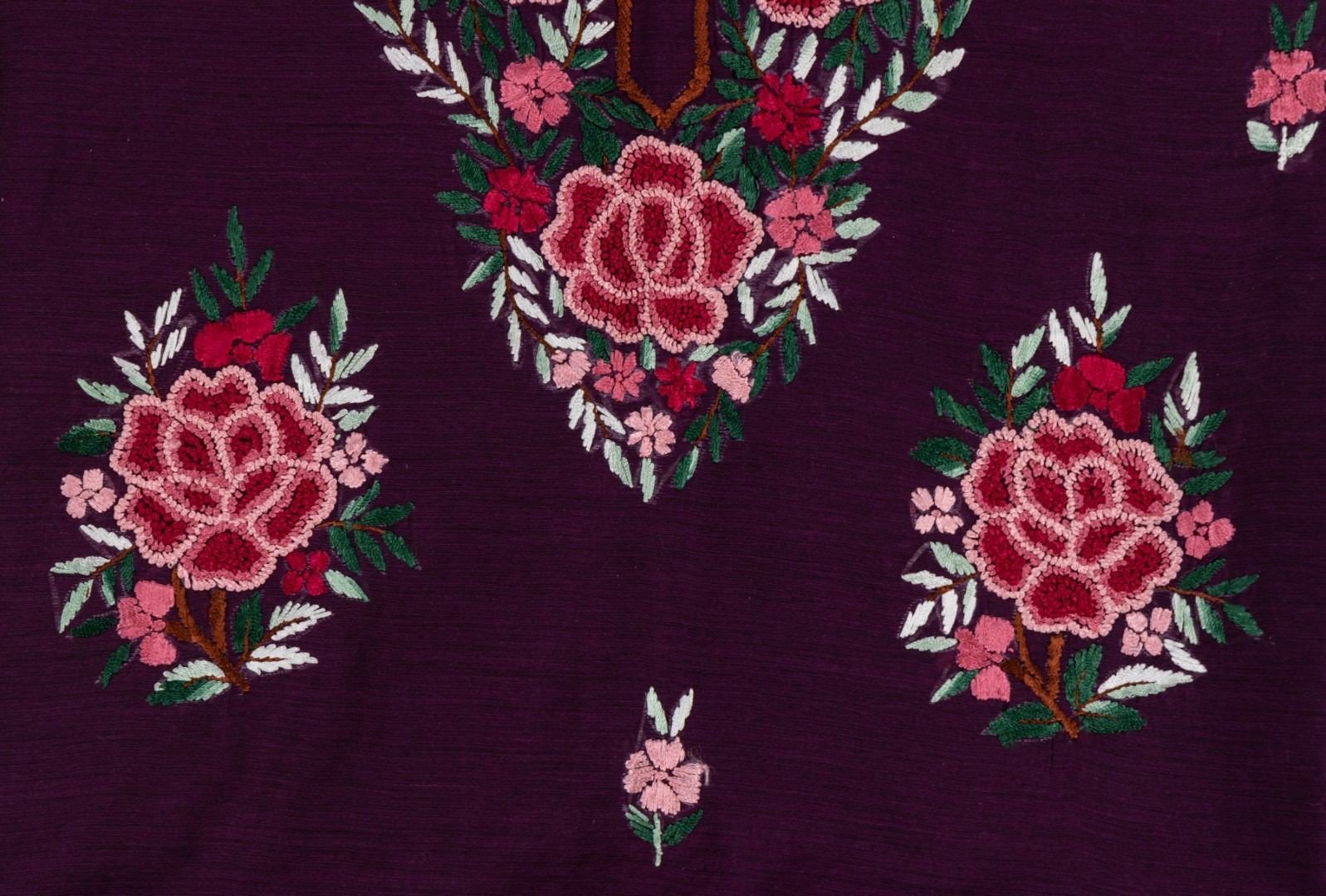 This wine color chanderi cotton hand embroidered unstitched kurta offers a comfortable & relaxed silhouette to the wearer, the fabric & embroidery is skin friendly.