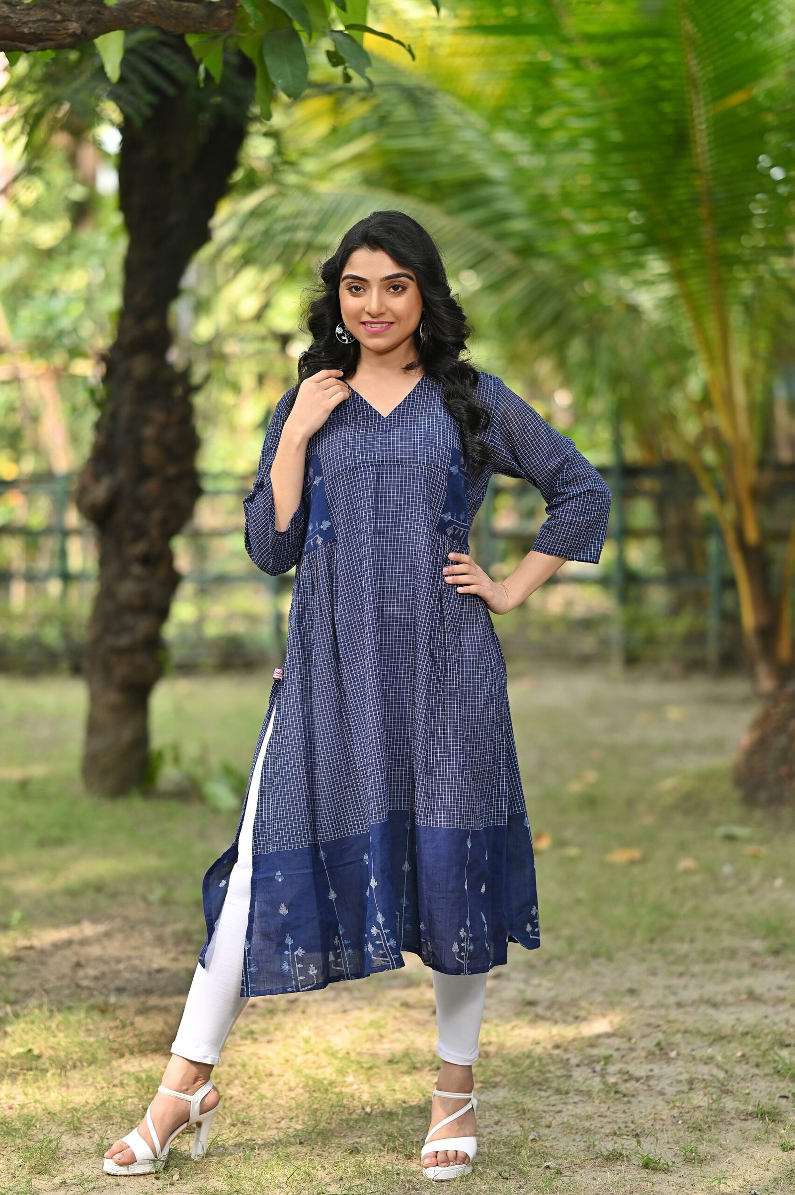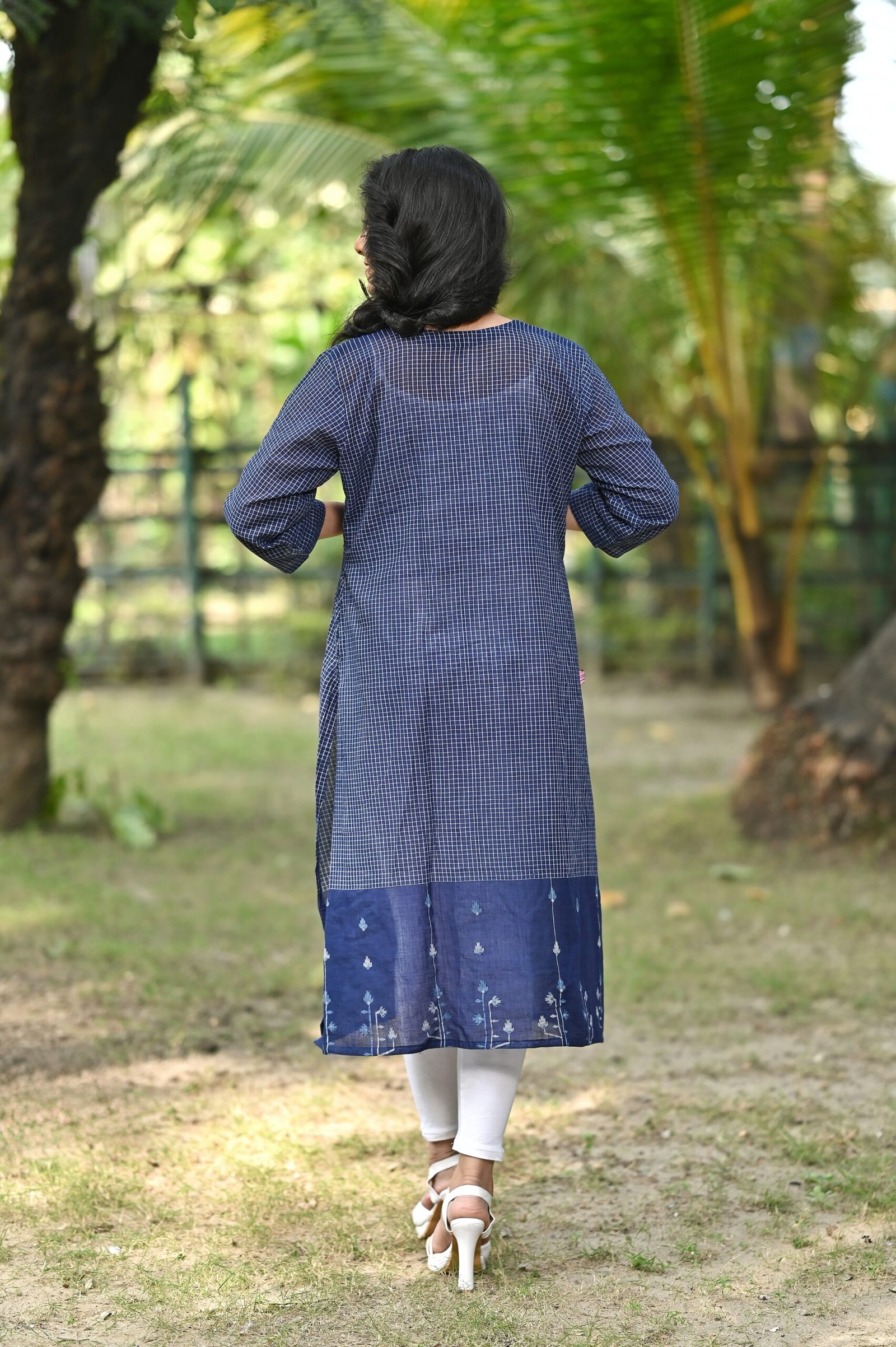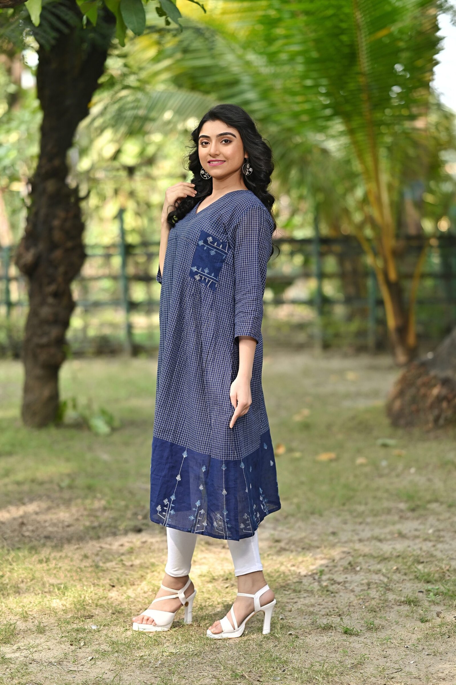 This blue and white check handloom  cotton jamdani kurti offers a comfortable & relaxed silhouette to the wearer, the fabric is skin friendly.