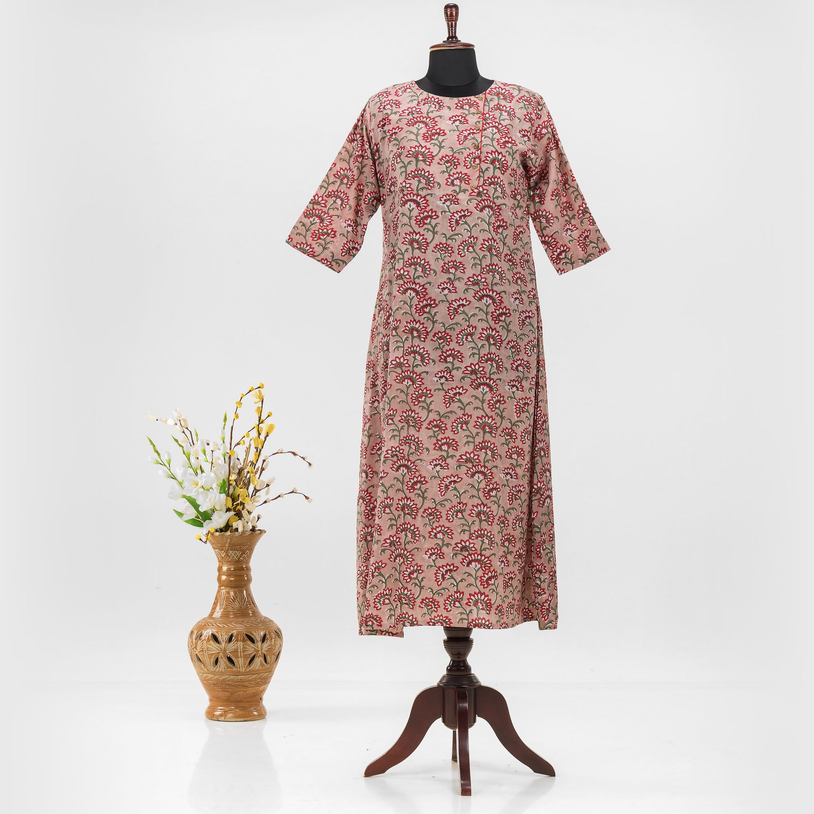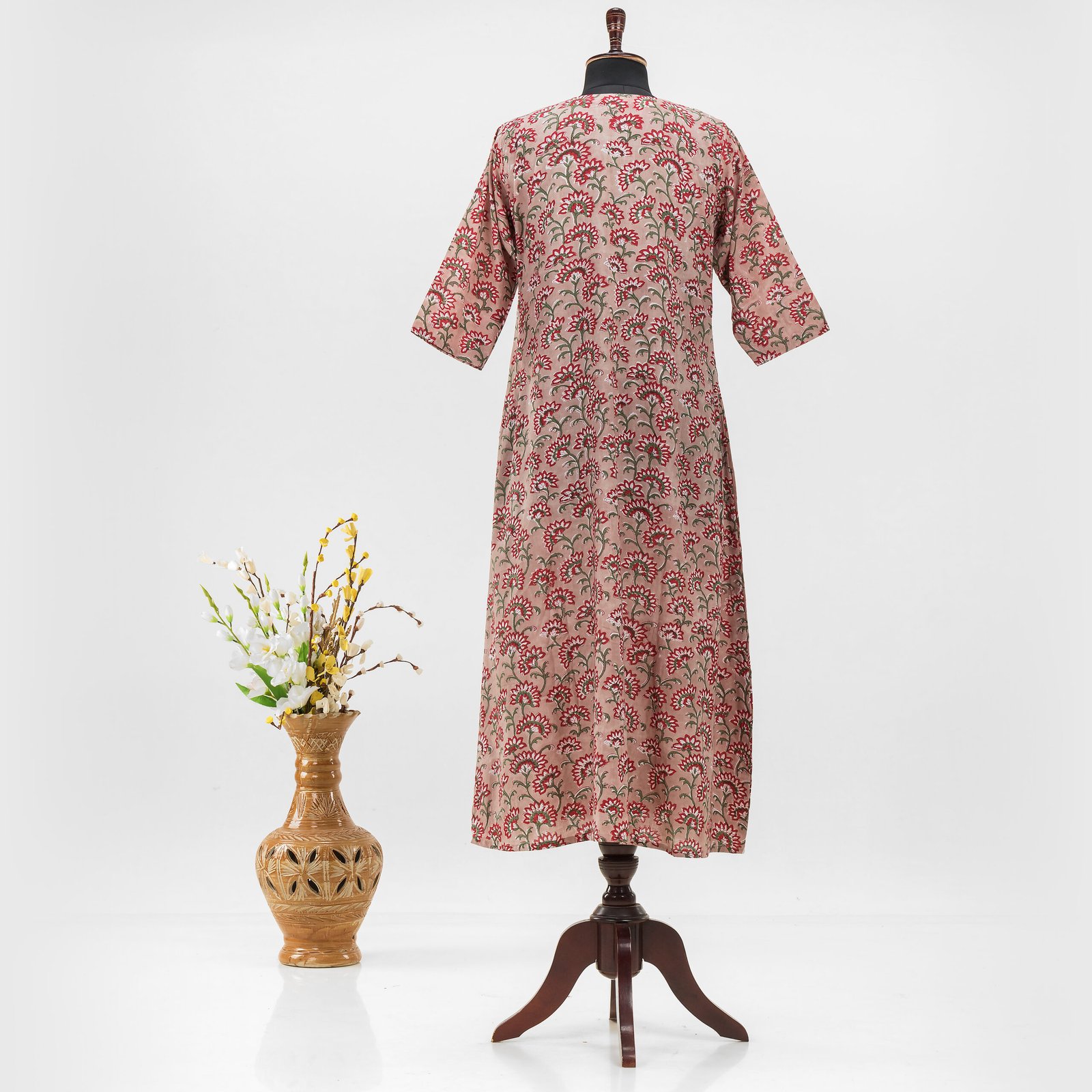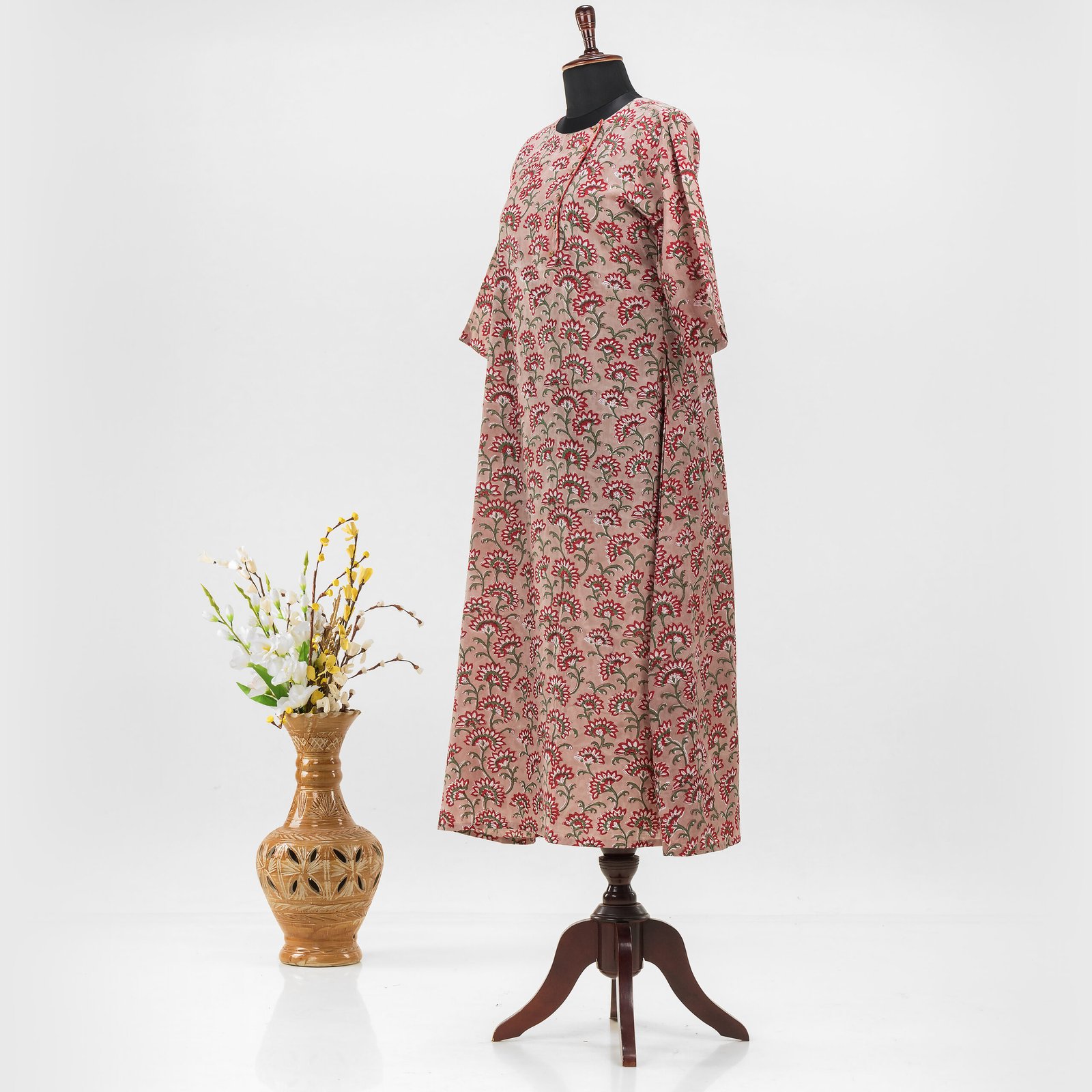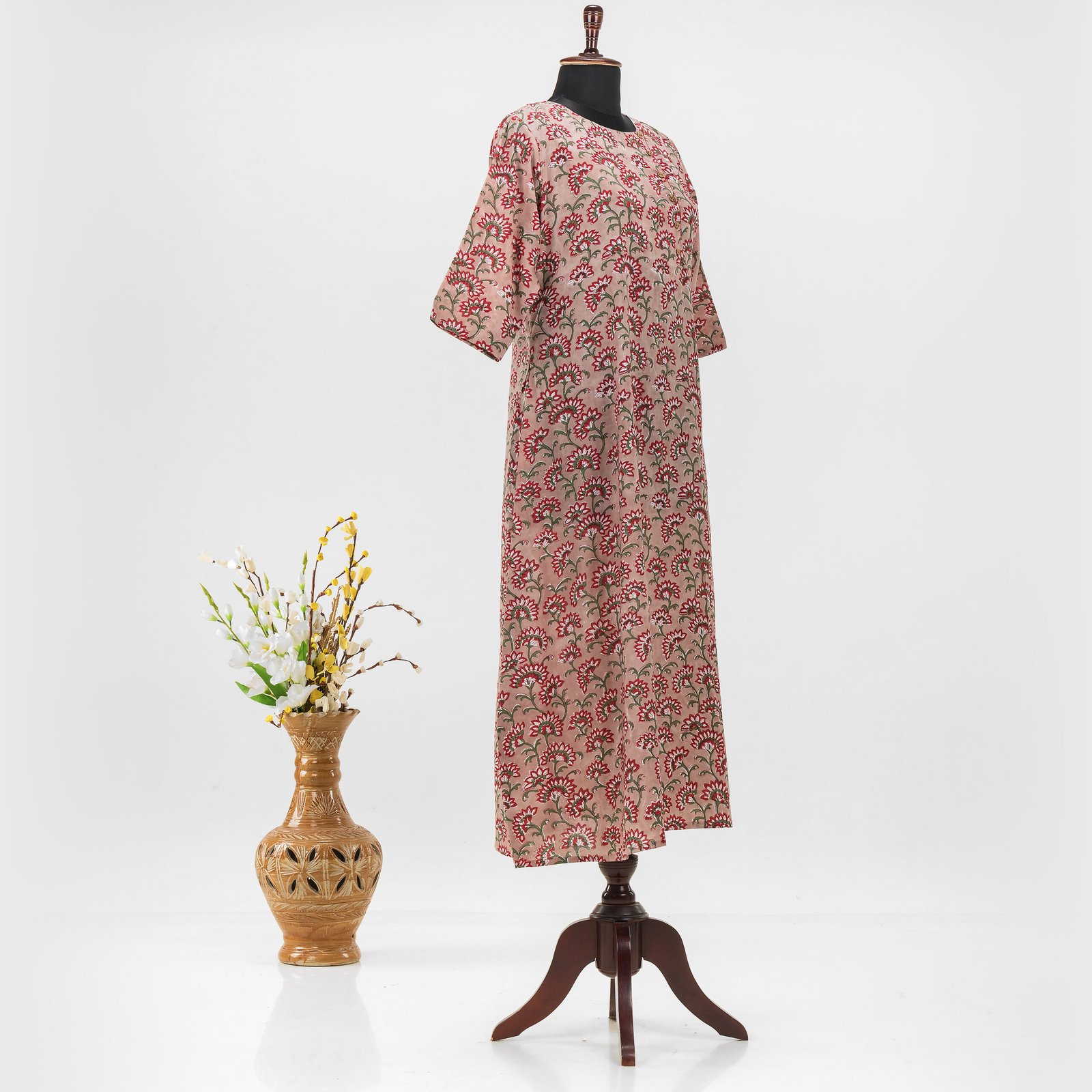This Cafe Au Lait color hand-block cotton long dress offers a comfortable & relaxed silhouette to the wearer, the fabric is skin friendly.