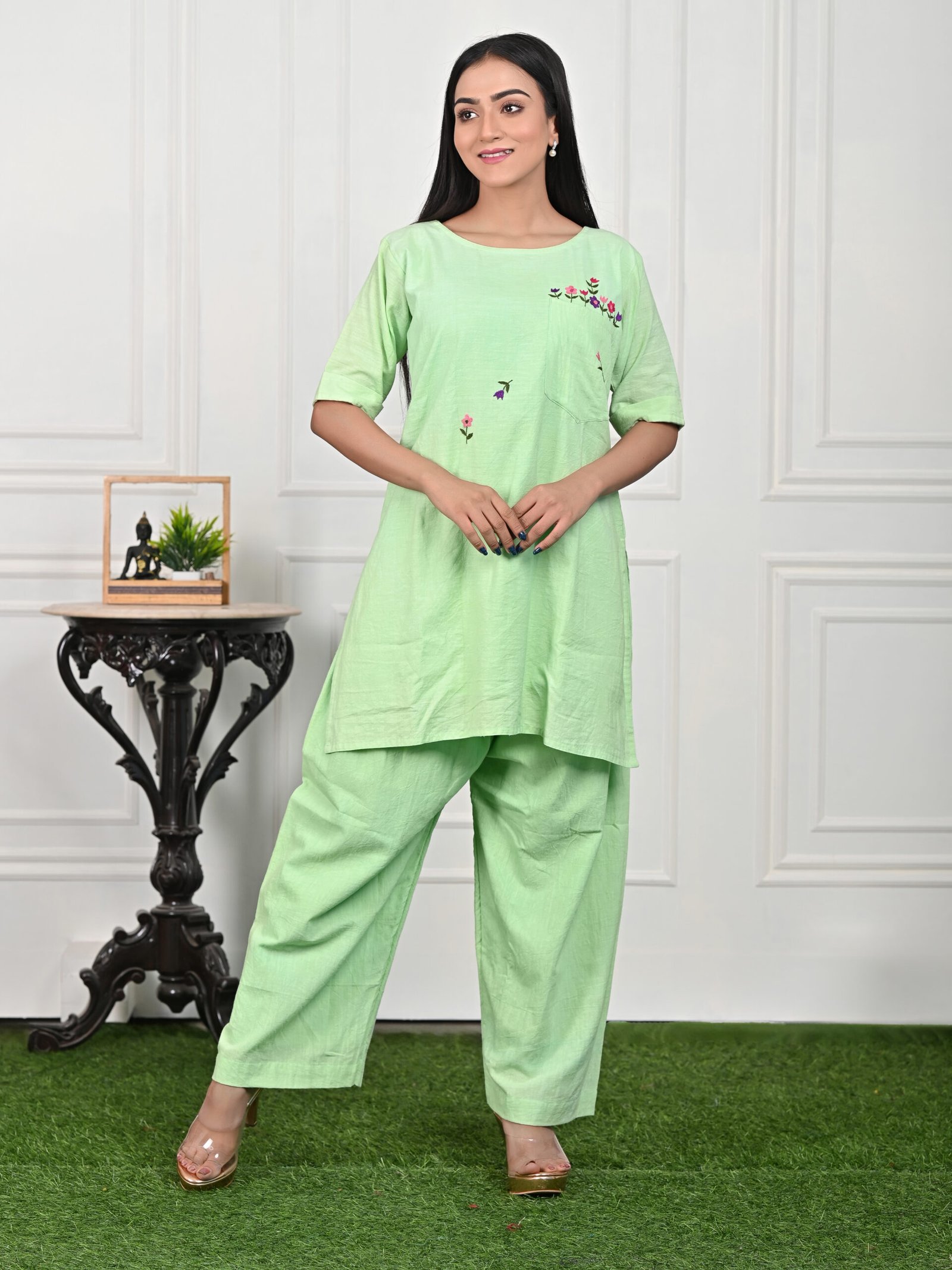 Adrika’s Handloom Cotton light green hand embroidered Co-Ord Set