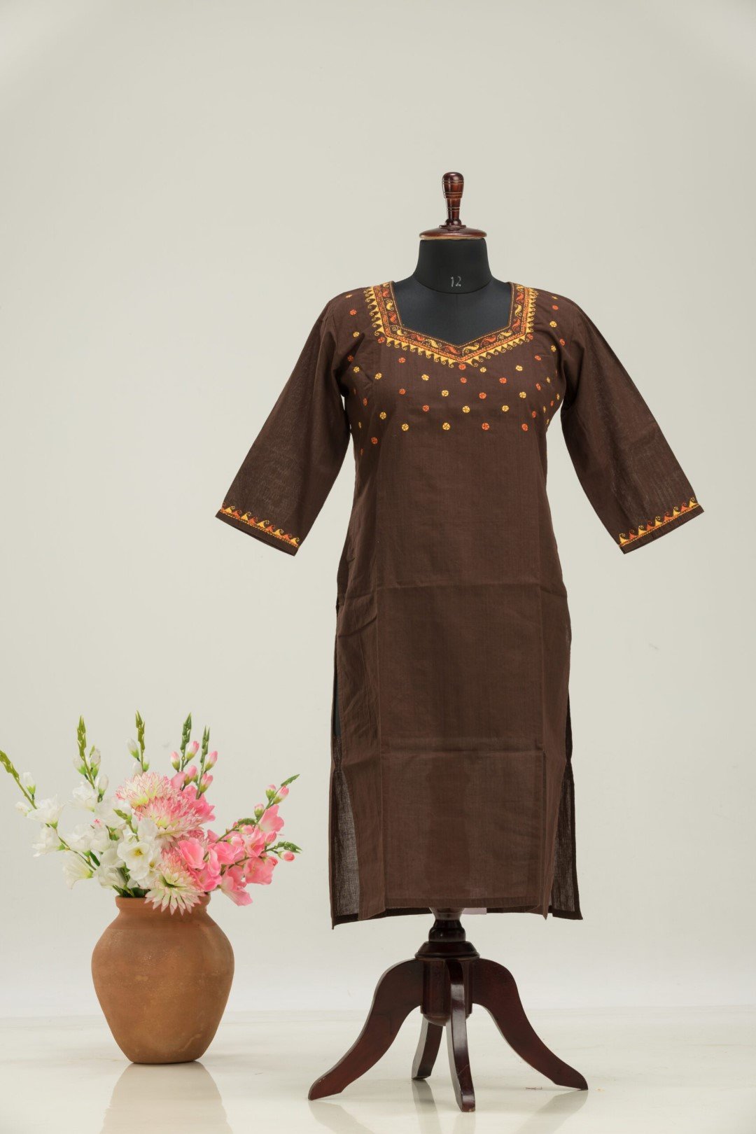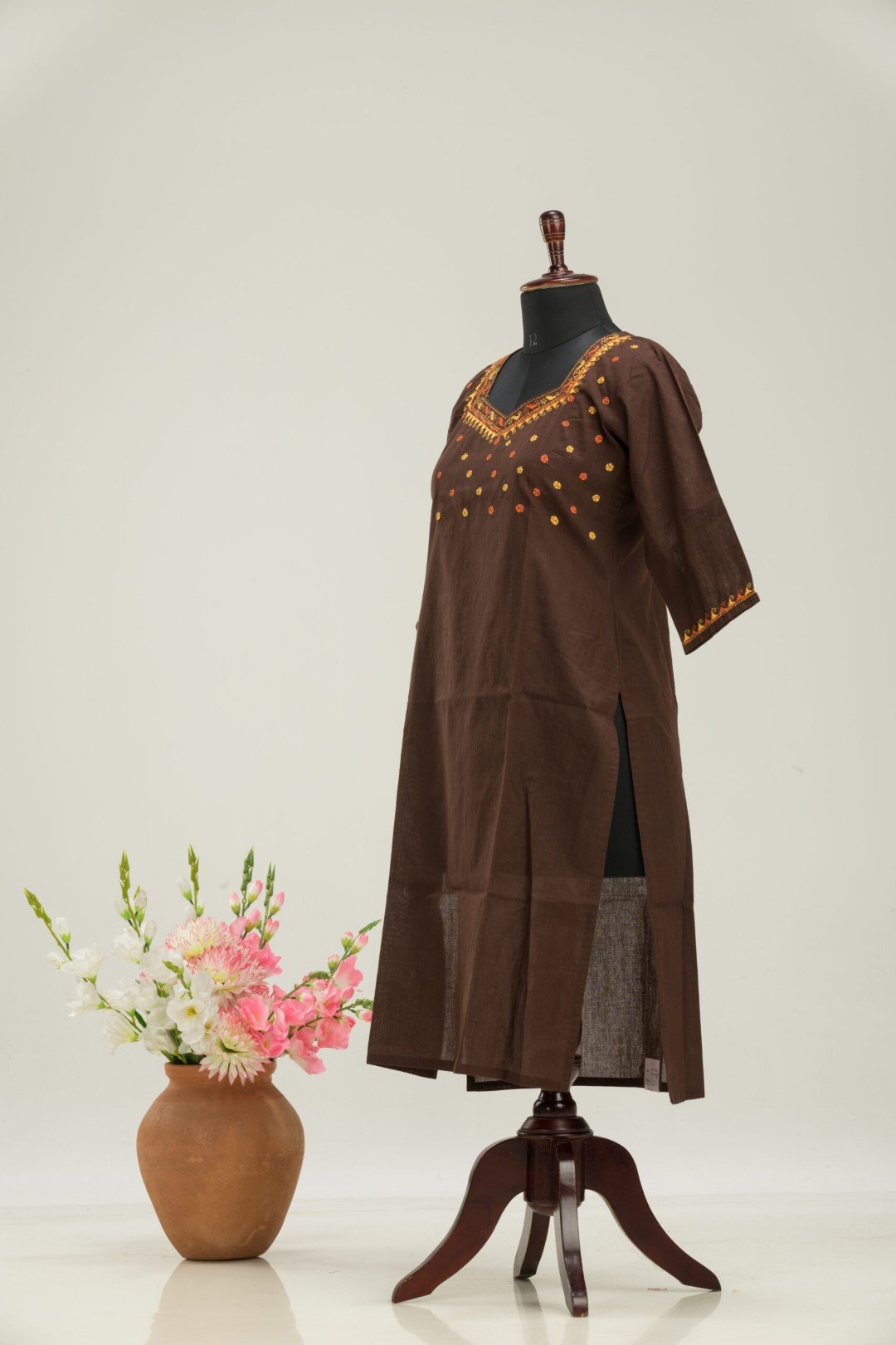 Adrika’s dark brown pure cotton hand embroidered kurti
