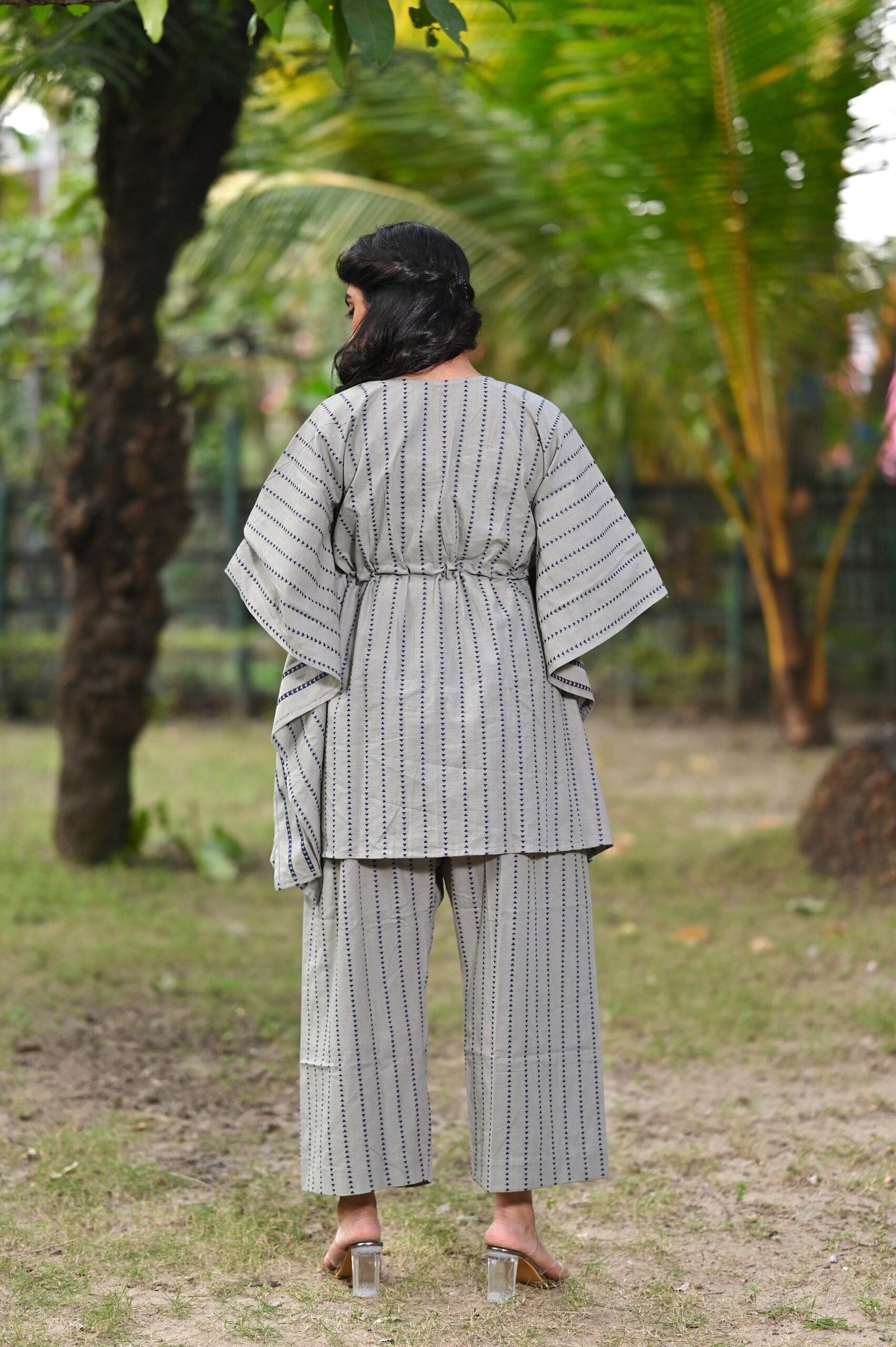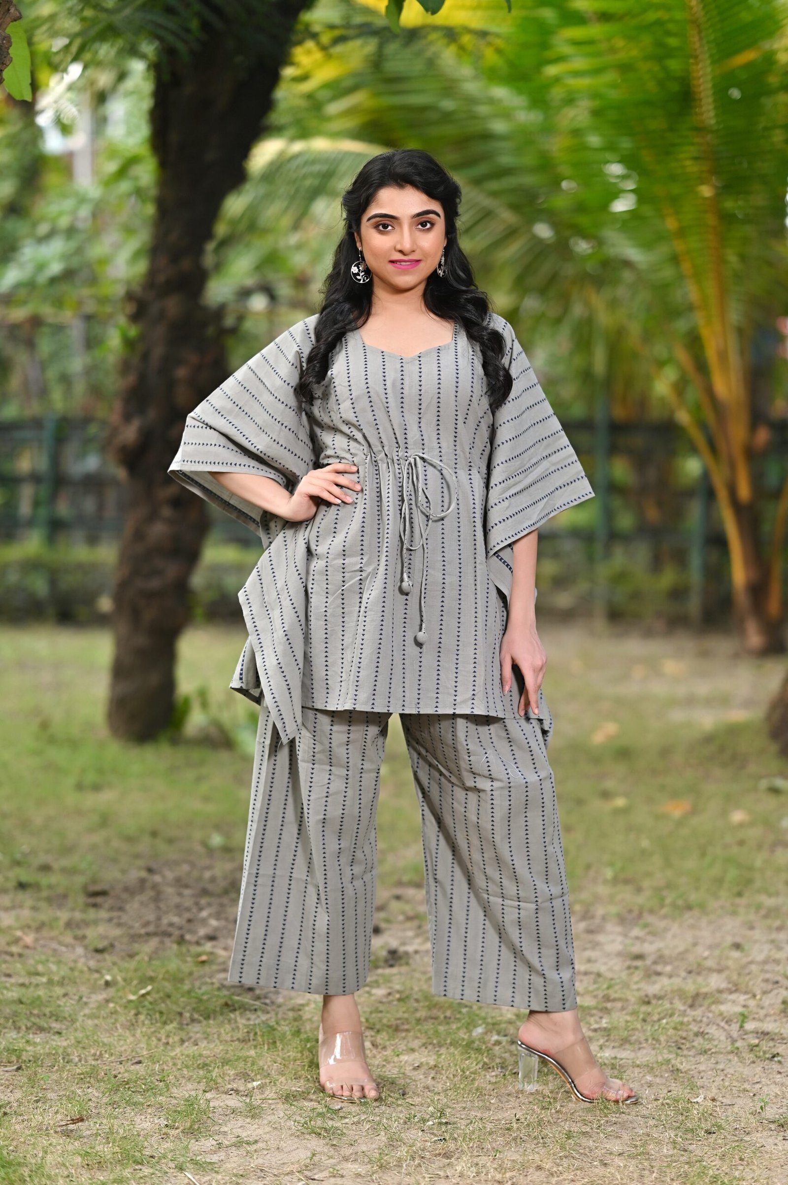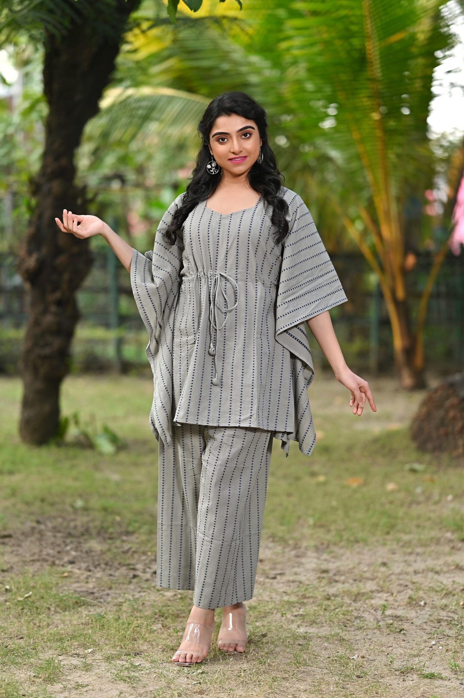 This grey pure cotton 2pc kaftan set offers a comfortable & relaxed silhouette to the wearer, the fabric is skin friendly.