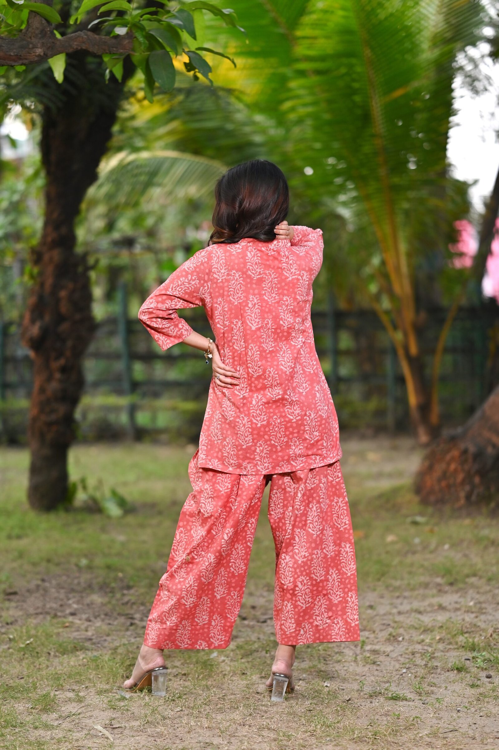 This pure cotton dabu light brick red co-ord set offers a comfortable & relaxed silhouette to the wearer, the fabric is skin friendly.