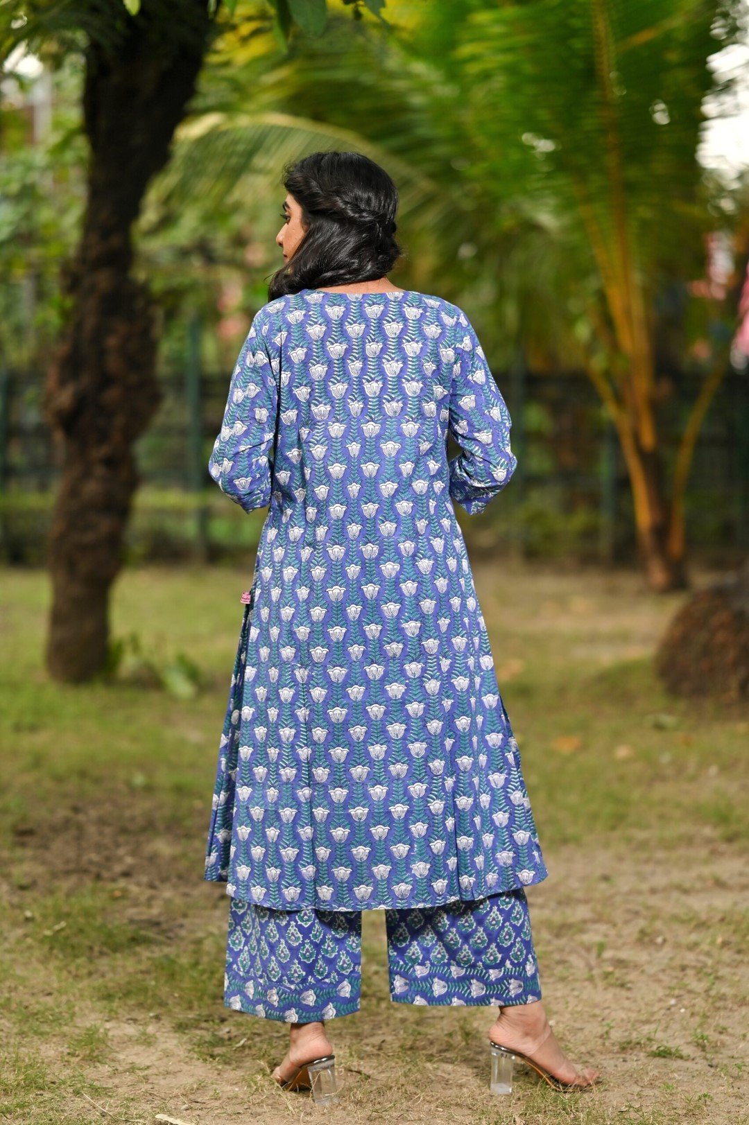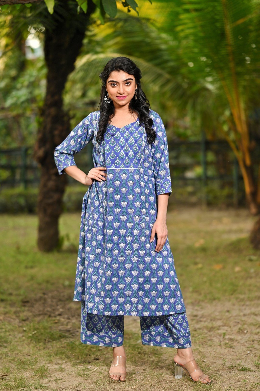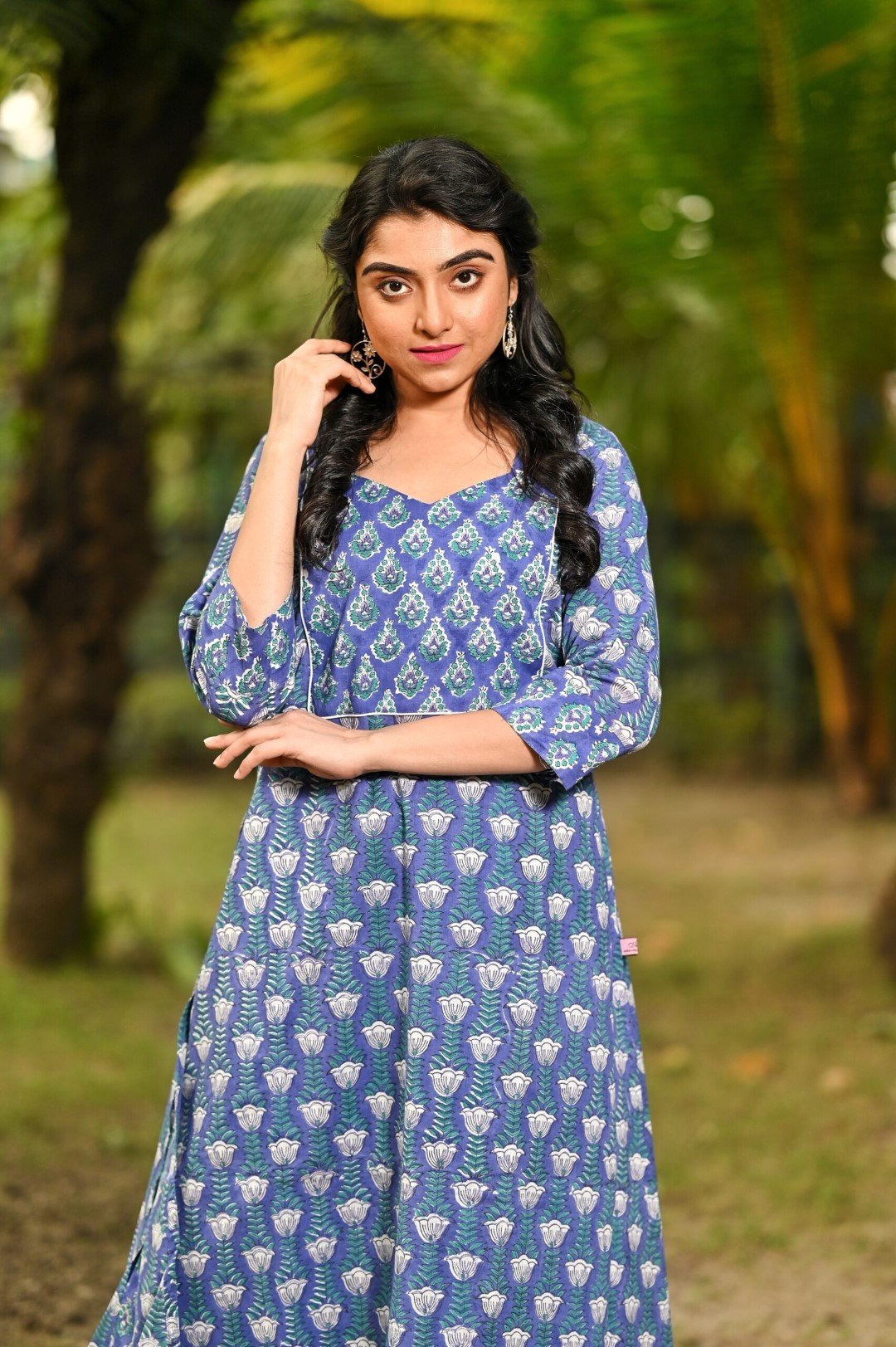 Adrika’s pure cotton hand block blue 2Pc kurti set