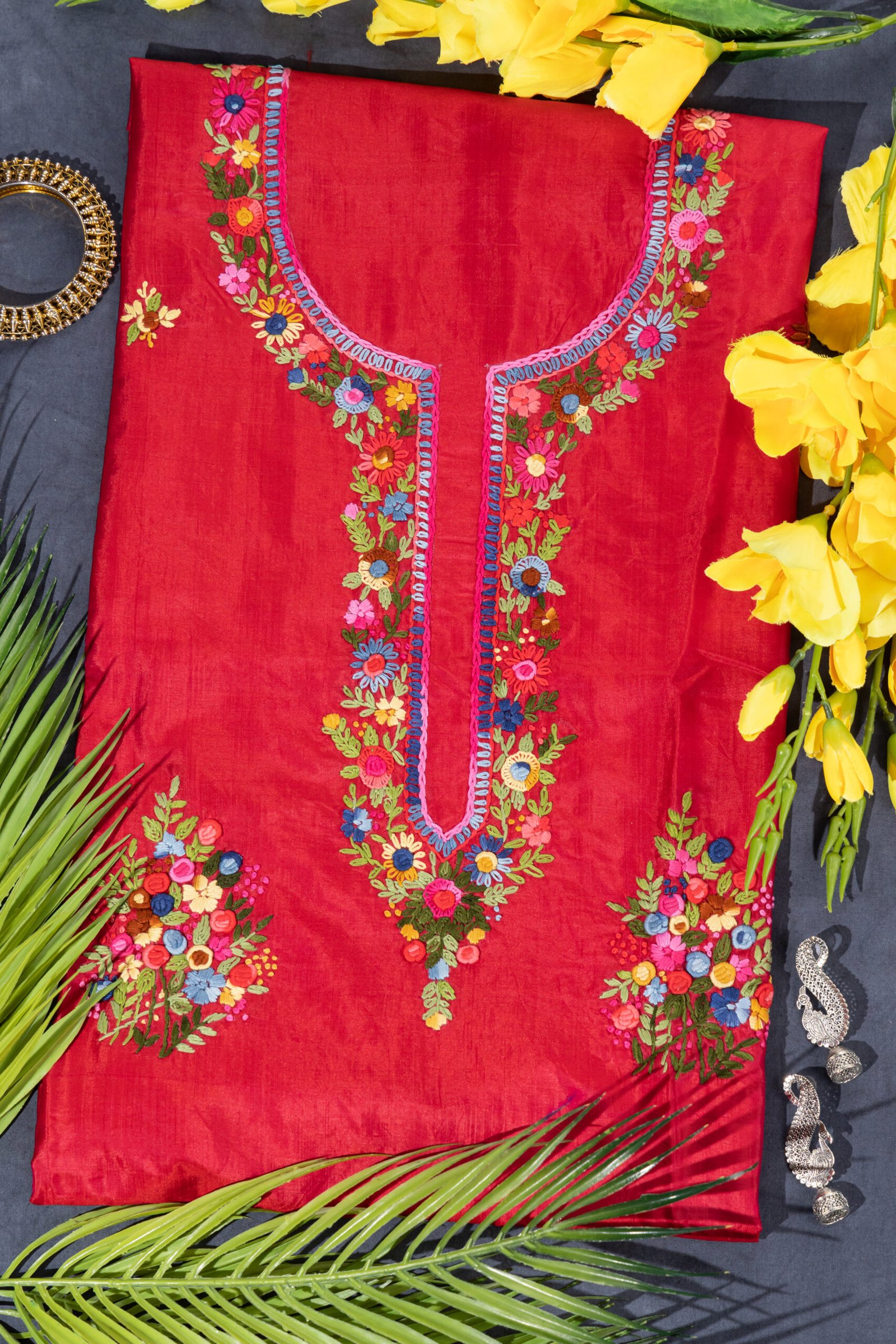 Be the first to review “Adrika’S Red Hand Embroidered Bishnupuri Silk Unstitched Kurti”