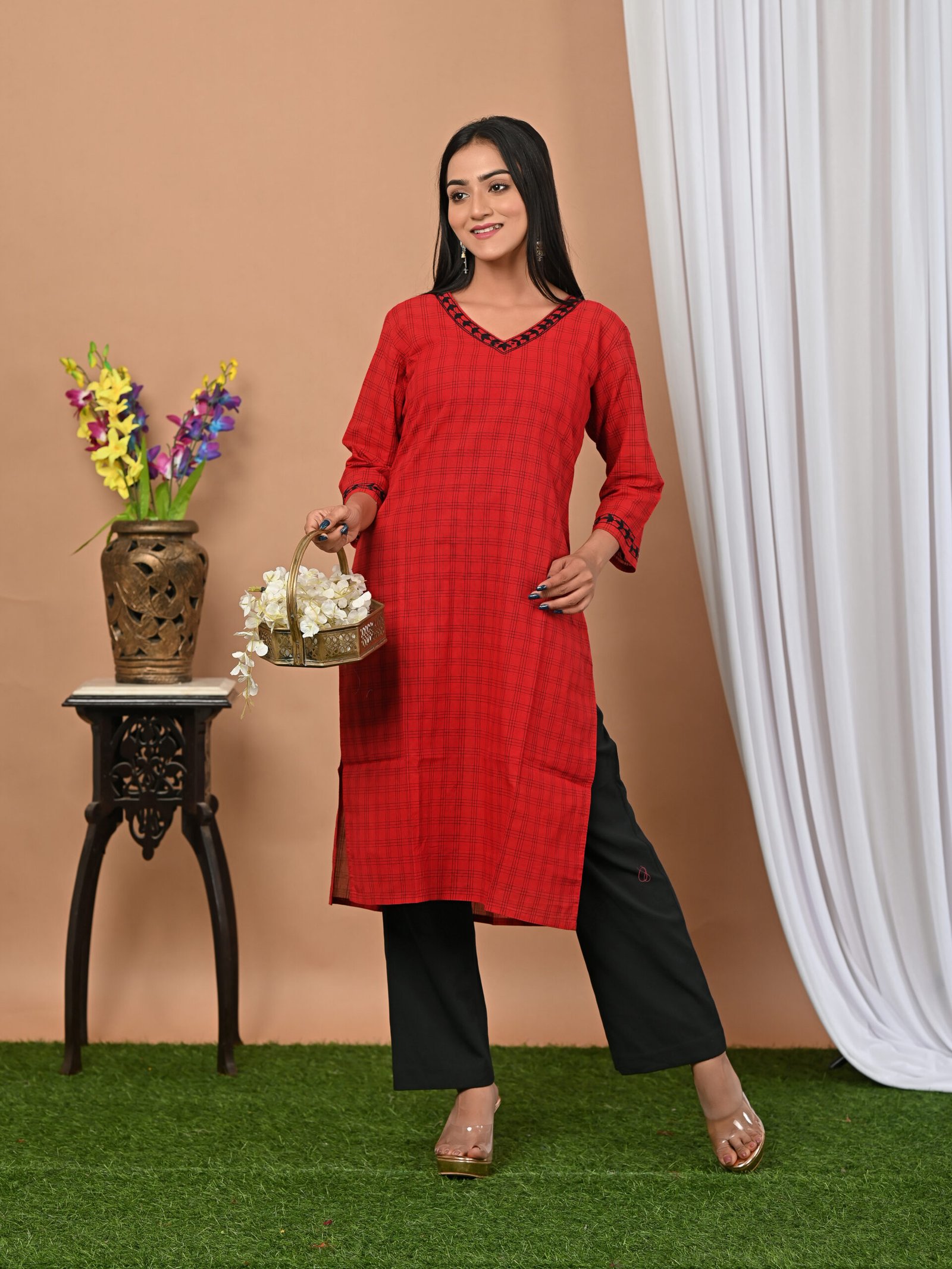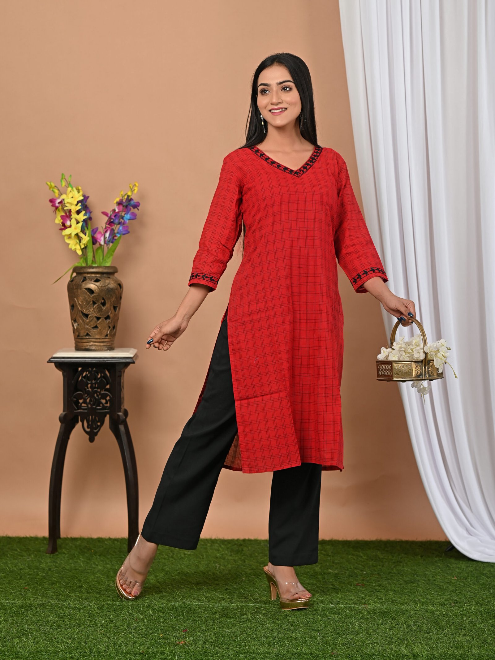 Adrika’s red with black checks pure cotton hand embroidered kurti