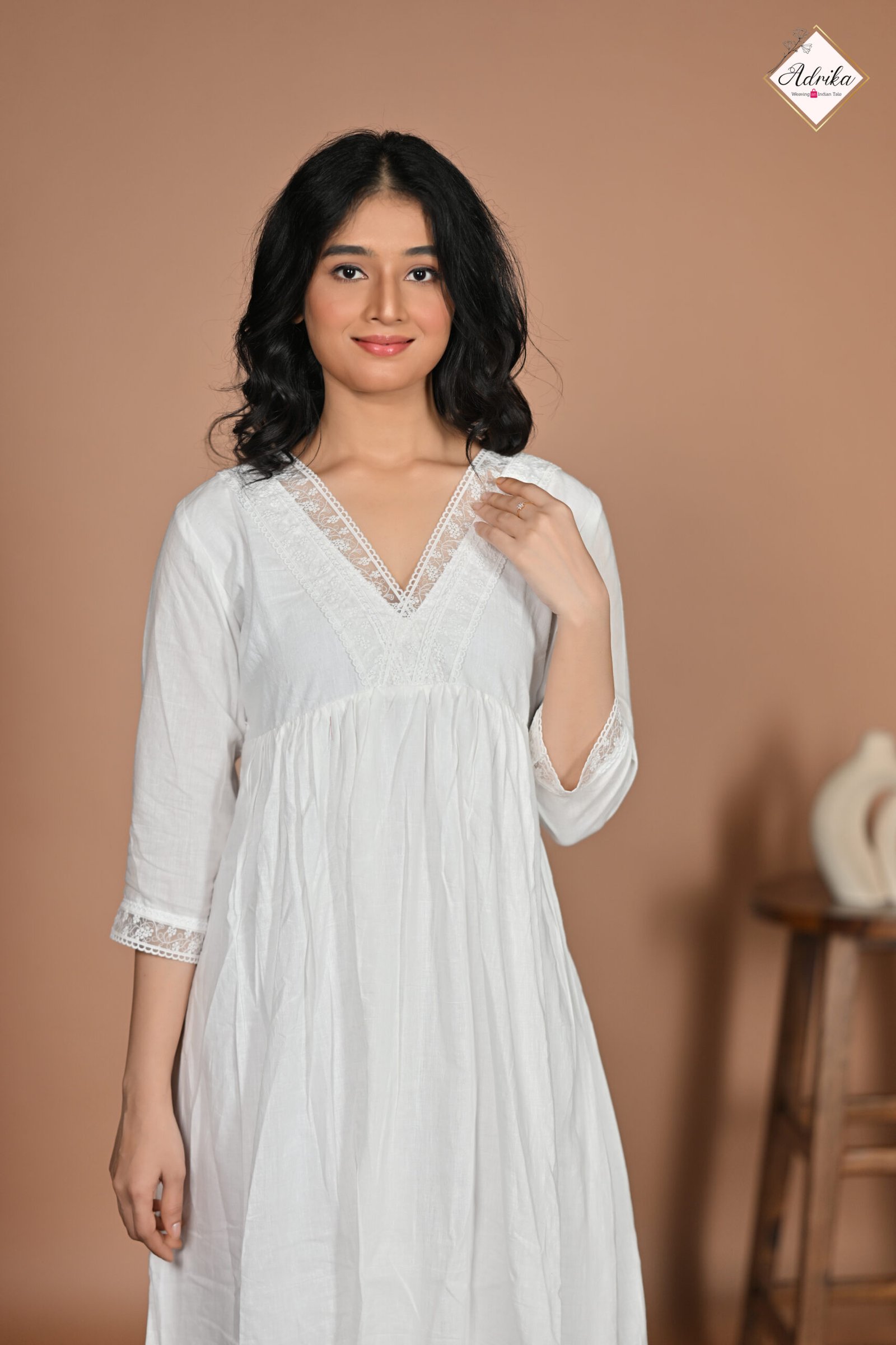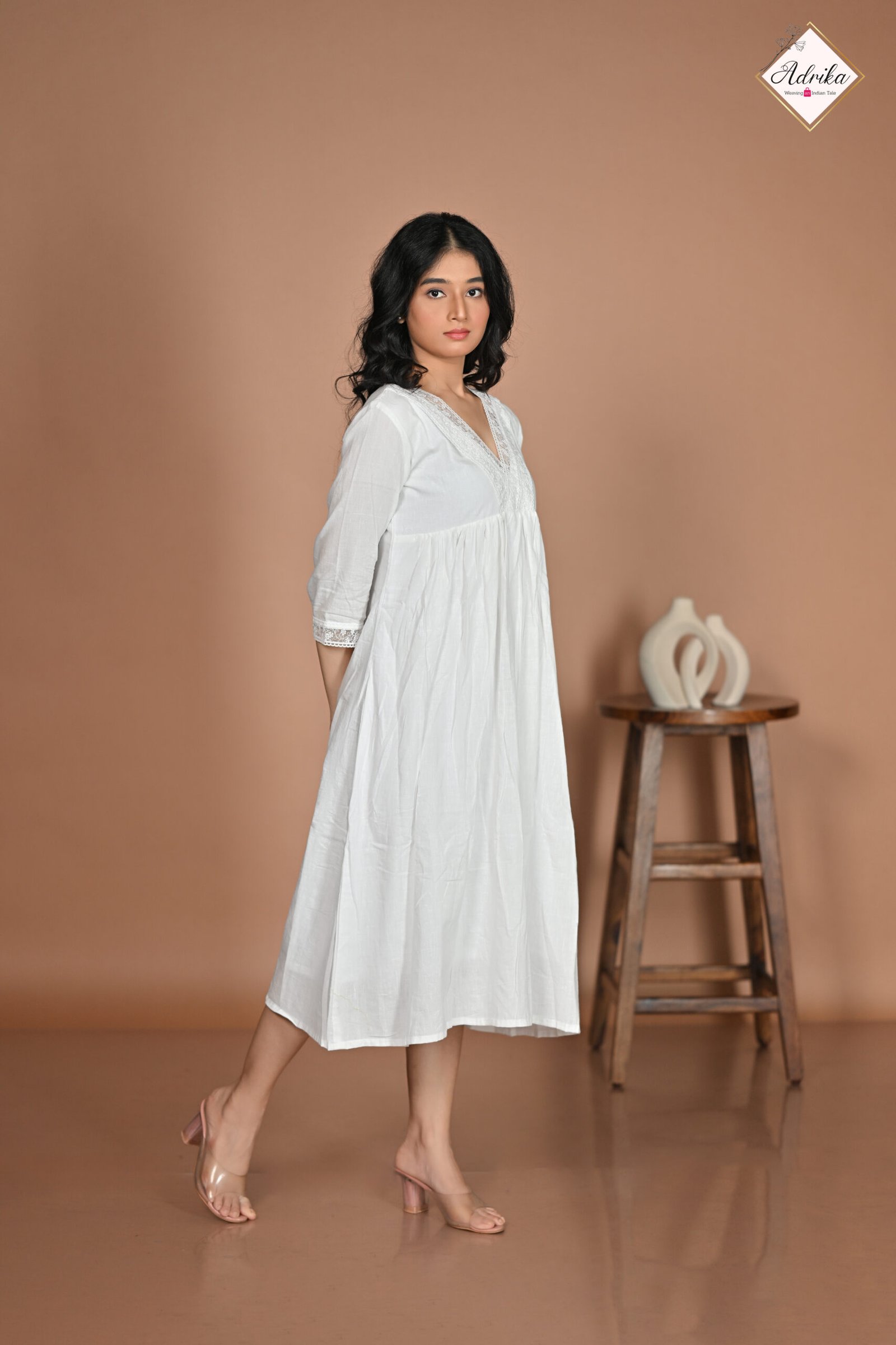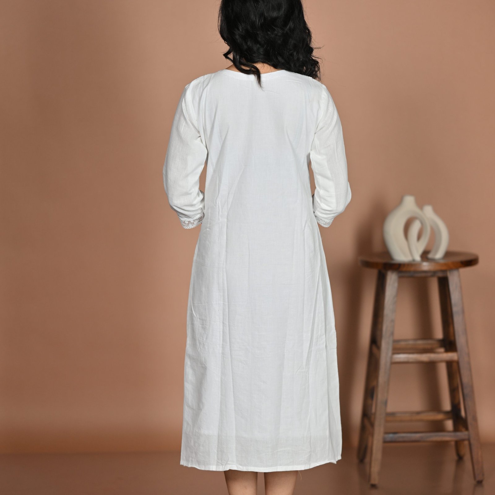 This white handloom cotton dress with lace works offers a comfortable & relaxed silhouette to the wearer, the fabric is skin friendly.