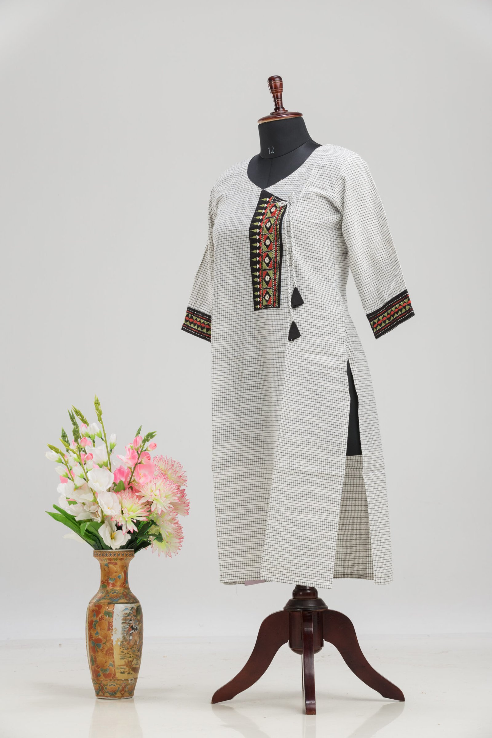 Adrika’s White With Black Checks Pure Cotton Hand Embroidered Kurti