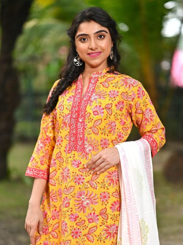 Adrika’s Yellow Pure Sanganeri Cotton 3 Pc Kurti Set